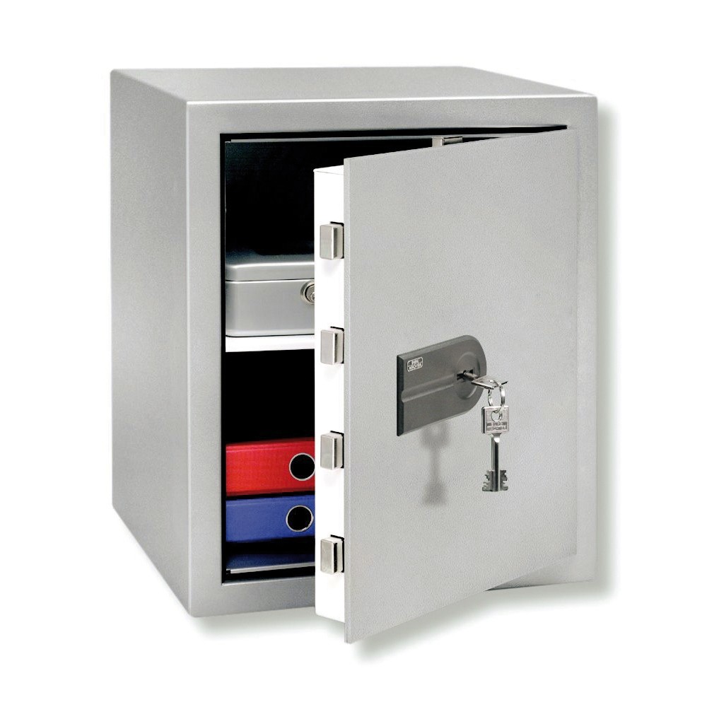 EAN 4003482190906 Produktgewicht (kg) 60,00 kg Farbe silber RAL Farbe Platingrau (RAL 7036) Höhe 530 mm Breite 430 mm Tiefe 390 mm Einbruchsicherheit Widerstandsgrad 0 (N) nach EN 1143-1 Türschloss mit Hochsicherheits-Doppelbartschloss Eigenschaften Fachböden, Montagezubehör, Ordnertiefe, Panzerschrank -
