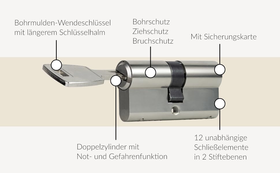 Der hochwertige Schließzylinder Dolomit von FELGNER bietet umfangreiche Sicherheitsfunktionen, darunter eine Sicherungskarte zur Kontrolle der Schlüsselkopien. Er zeichnet sich serienmäßig durch effektiven Bohr- und Ziehschutz aus und verfügt über 12 unabhängige Schließelemente in zwei Stiftebenen, die einen hohen Schutz gegen unbefugtes Öffnen gewährleisten. Mit der praktischen Not- und Gefahrenfunktion kann die Tür auch dann geöffnet und geschlossen werden, wenn der Schlüssel auf der gegenüberliegenden Seite steckt. Der Zylinder wird mit drei Bohrmuldenschlüsseln geliefert, die einen zusätzlichen Picking-Schutz bieten. Dank des langen Schlüsselhalms ist er ideal für hochsichere Schildgarnituren geeignet und eignet sich hervorragend für Wohnungstüren sowie Hauseingangstüren. Zudem ist er zulässig für Feuerschutztüren gemäß Feuerschutzklasse B, T90. Die Qualität „Made in Germany“ garantiert eine zuverlässige und robuste Sicherheitslösung.
