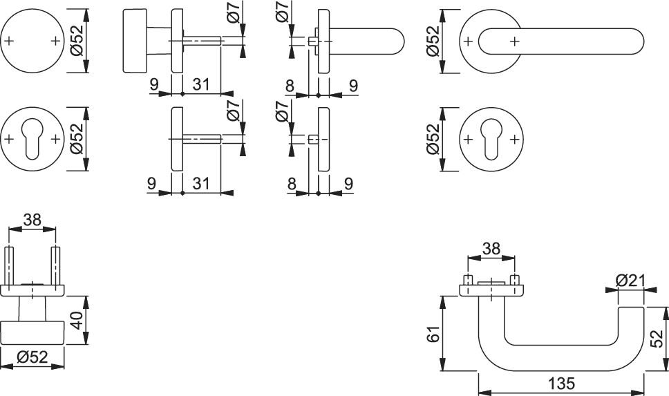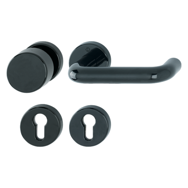 - Lagerung: außen Knopf fest, innen Türgriff fest/drehbar, wartungsfreies Gleitlager