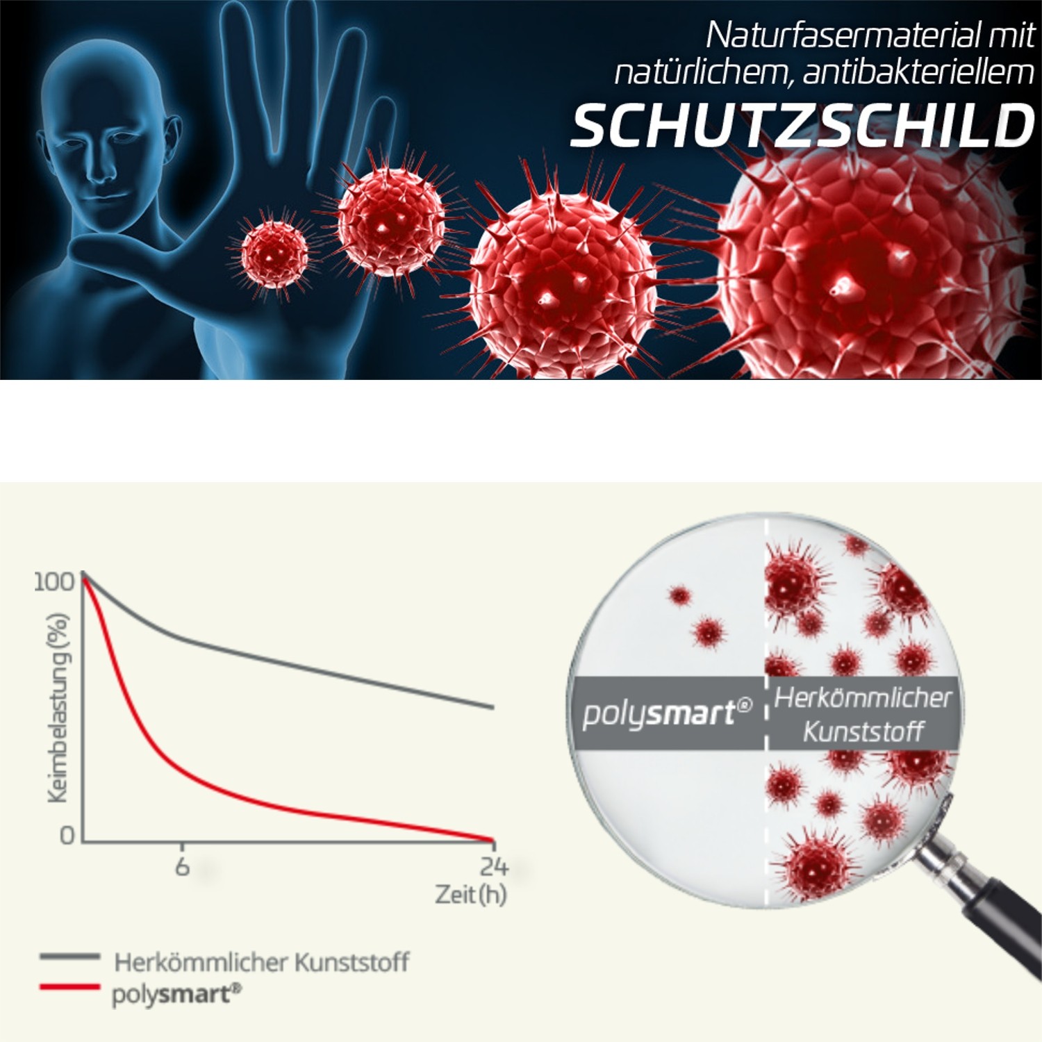 Die antibakterielle Wirkung wird durch einen natürlichen Wirkstoff erzielt. In polysmart® sind keine Metallionen, Metallsalze, Nanopartikel oder synthetische Wirkstoffe enthalten.