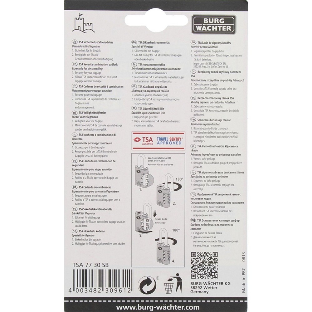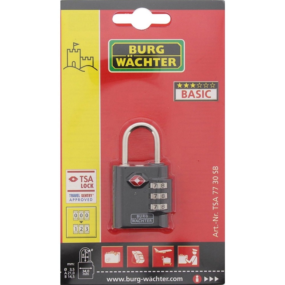 EAN 4003482309612 Produktgewicht (kg) 0,05 kg Material Stahl Farbe schwarz Art TSA, mit Zahlen-Code Bügelstärke 3,5 mm Bügelbreite 14,5 mm Bügelhöhe 21 mm Schließung Zahlenrollen Sicherungskarte ohne Sicherungskarte Sicherheitsstufe einfach -